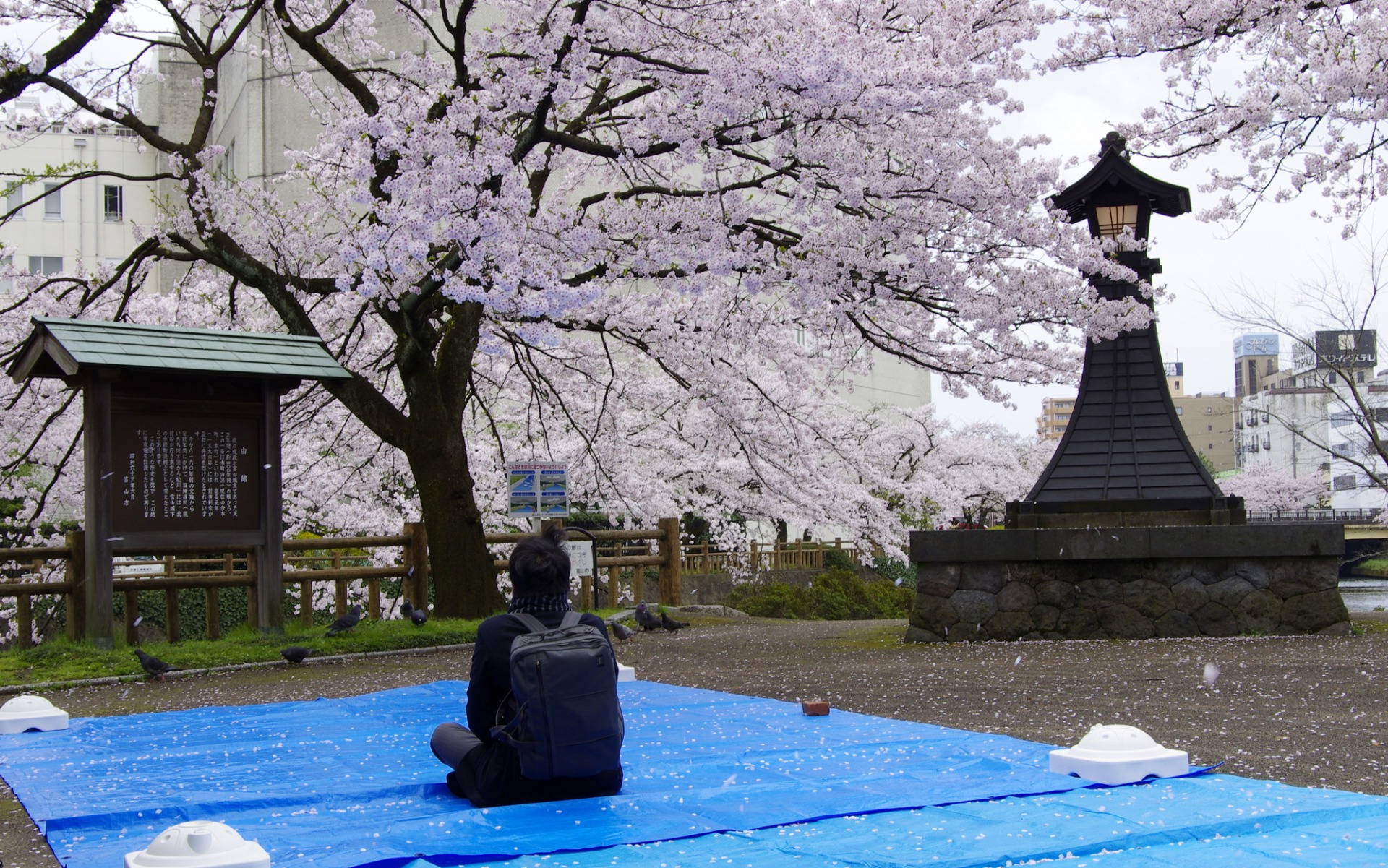 A lepedő nemcsak praktikus, hanem szinte a hanami vizuális szimbóluma is: ha Japánban tavasszal kék fóliákat látsz a parkban, biztos lehetsz benne, hogy ott hanami zajlik.