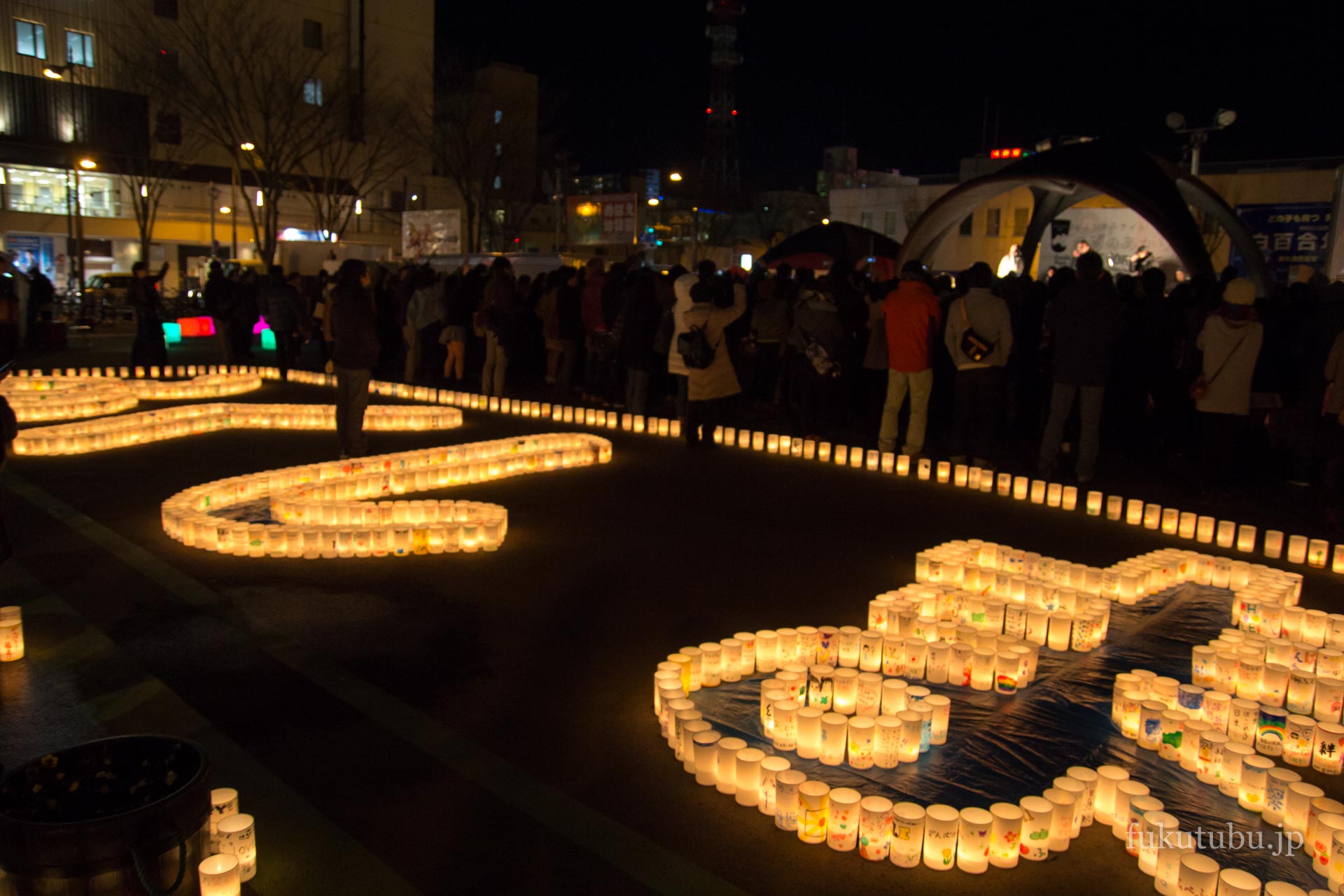 Ahogy leszáll az este, sok városban gyertyagyújtás kezdődik. A parkokban és tereken több ezer gyertya világít. Gyakran kirakják belőlük a "3.11" számot vagy a "kizuna" (絆) szót, amely japánul "köteléket" vagy "összetartozást" jelent. Papírlámpásokat is gyújtanak, amelyeket néha a folyókra vagy a tengerre engednek. Ez a szertartás a japán buddhista hagyományokból ered, és azt jelképezi, hogy a lámpások fénye az elhunytak lelkét kíséri.