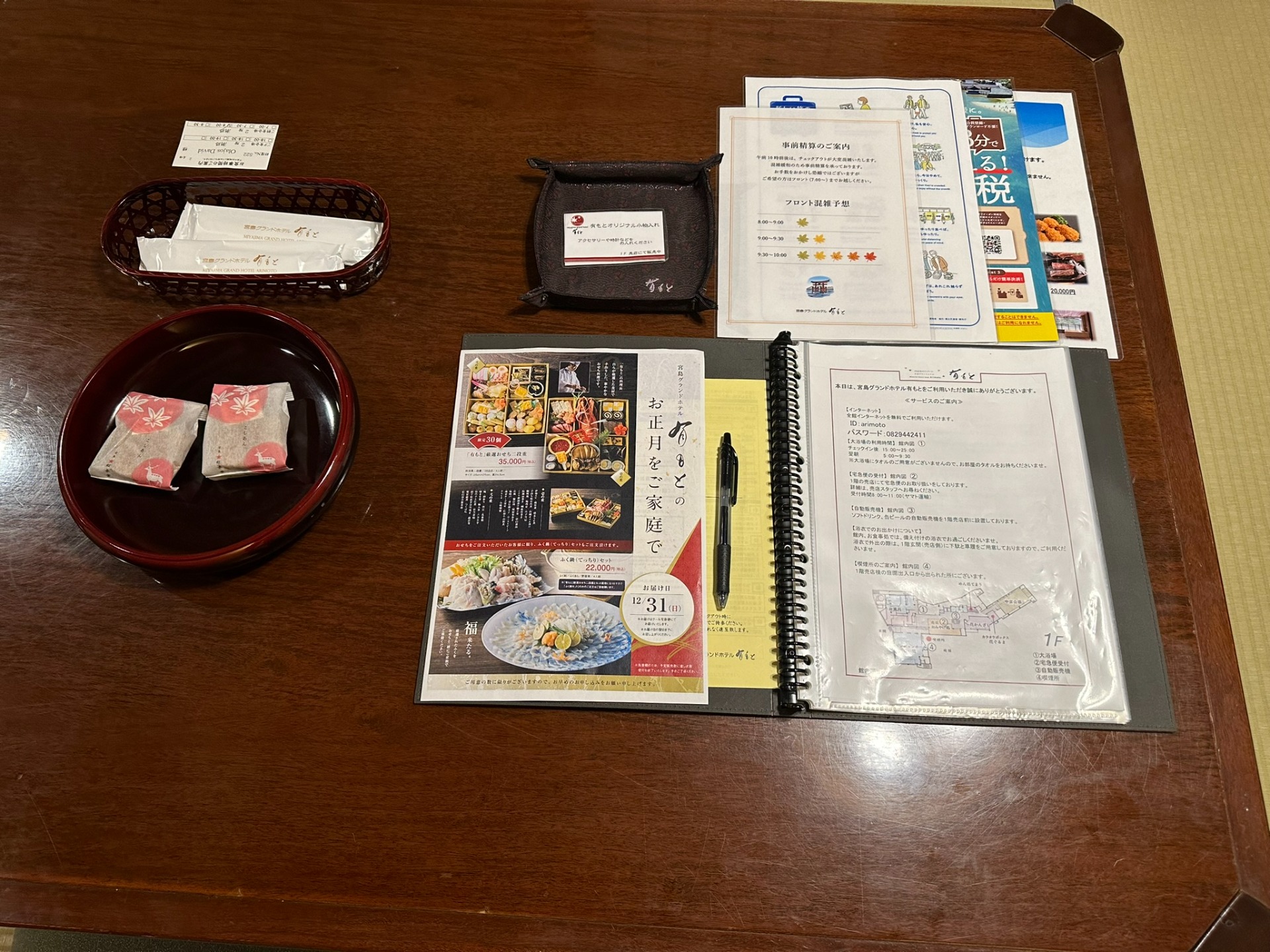Emellett a ryokan-ban, ahol megszálltunk Miyajima-n, az asztalon is várt minket két ajándék manjuu.😁😋