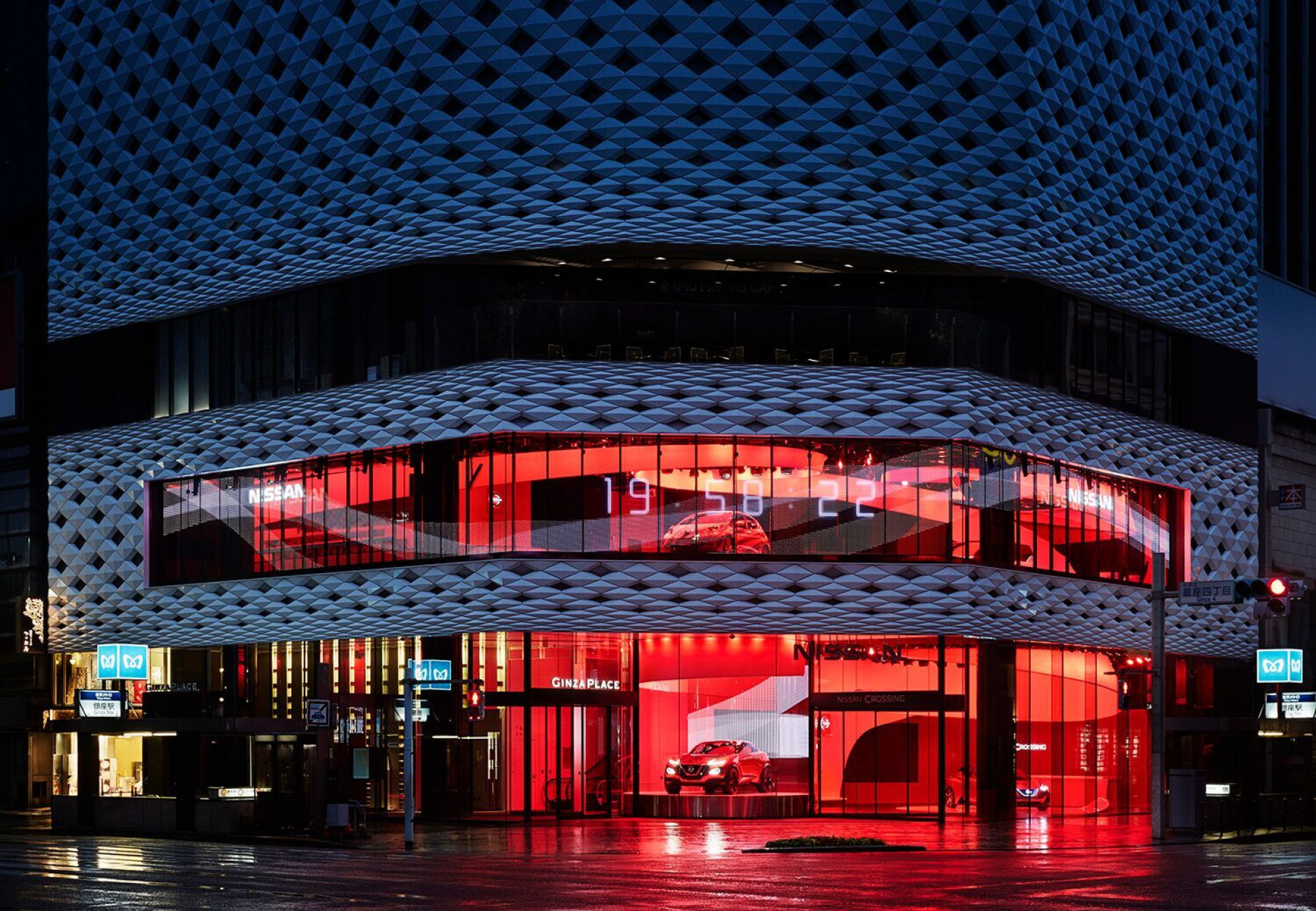 A külső homlokzat (a "Virtual Façade") üvegfelületekbe ágyazott LED-ekkel dolgozik: az épület maga is "élő", változó arculatot kap, ami nappal és éjszaka is látványosság. Így az egész bemutatóterem része lesz Ginzá-nak, mint városi látványosság. 🔦