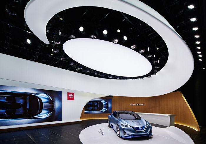 A Nissan Crossing egyik legemblematikusabb vonása az, hogy nem hagyományos "sorban kiállított autók" tér — a belső tér "spirál" (Spiral Stage) és nem-lineáris elrendezésű, ami a mozgást, az áramlást, a változást szimbolizálja. 📈