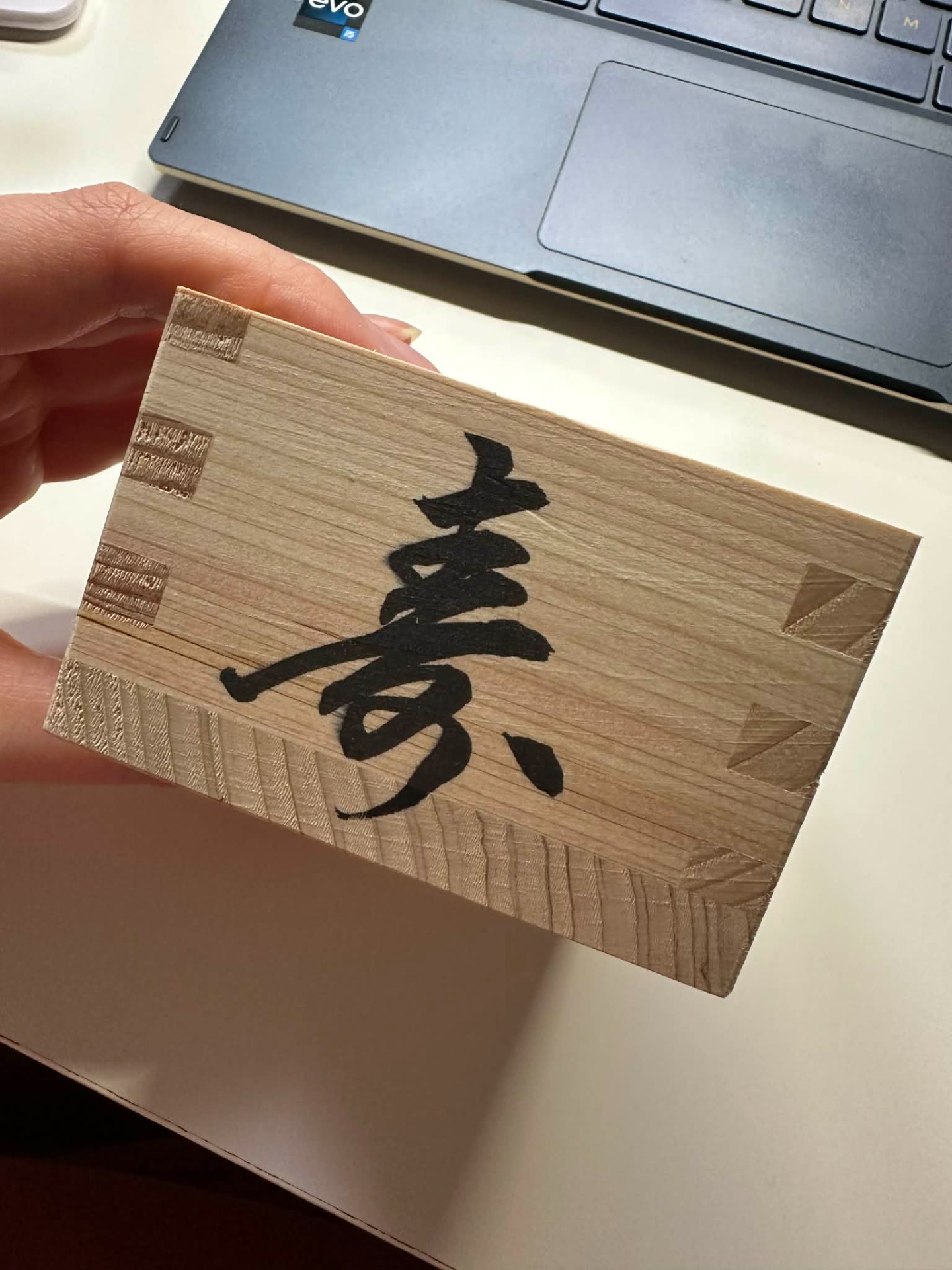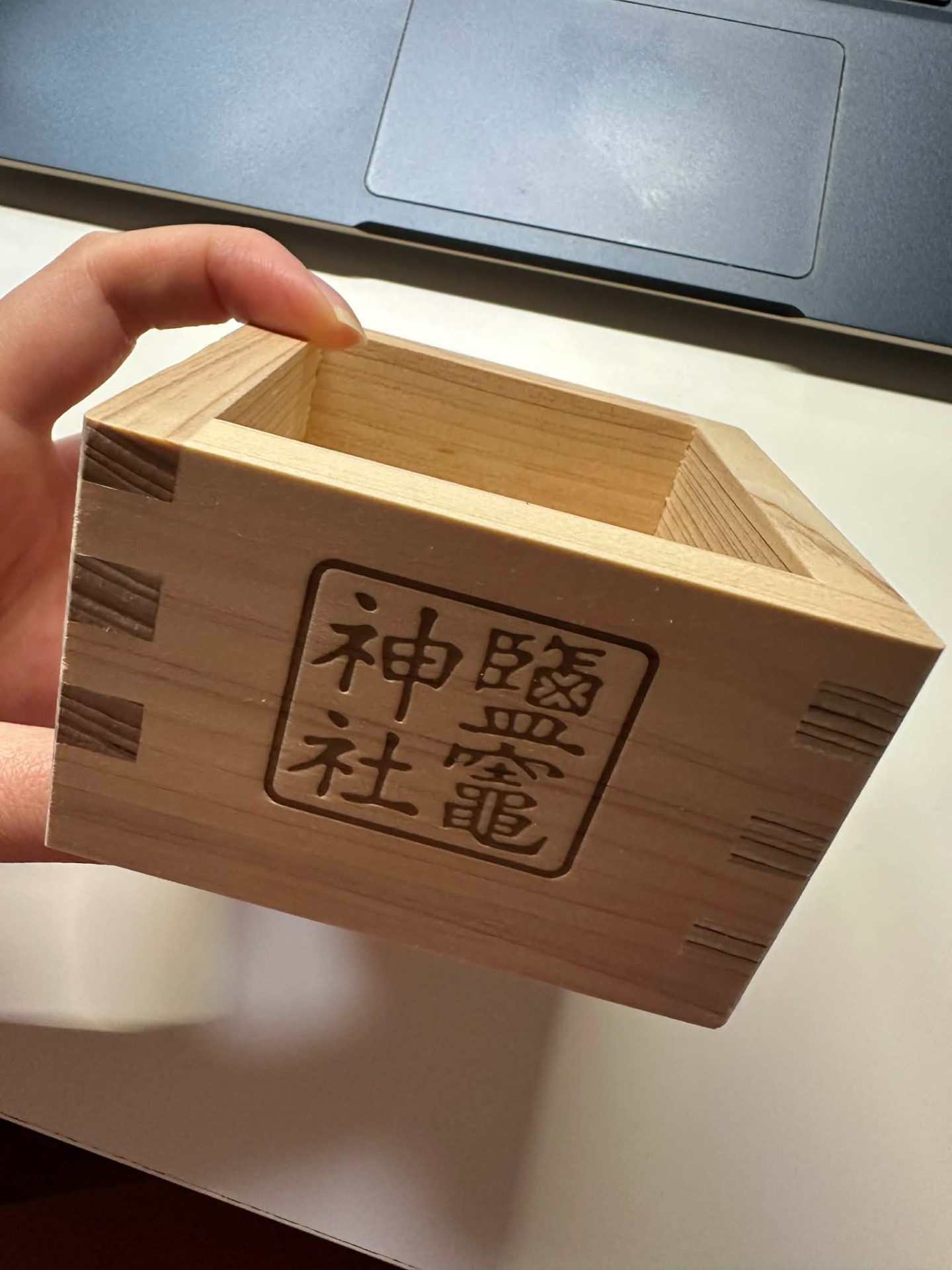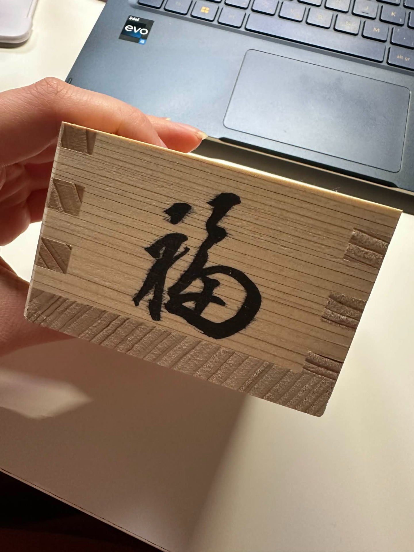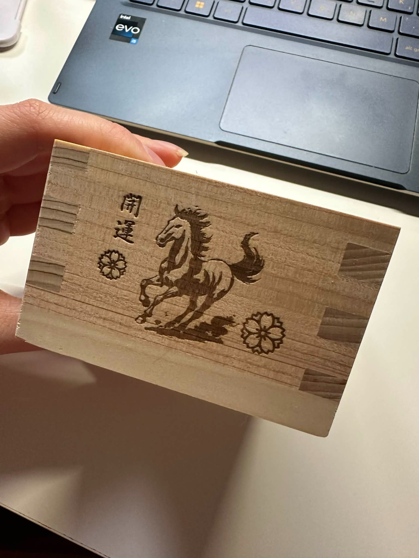 Kaptunk egy szakés fadobozkát, amire a helyik papok festik fel a "fuku"(福)szerencse és a "kotobuki"(寿)hosszú élet kandzsiját, valamint a szentély nevét és idén a ló évét nyomtatták rá.