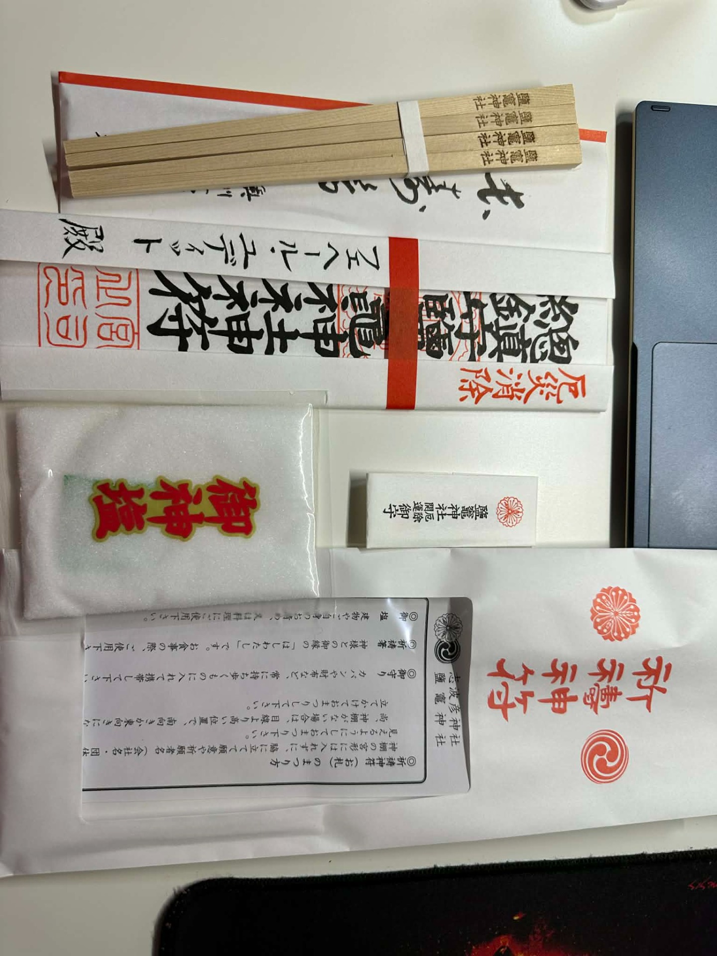 Aztán a szertartás végén mindenkit egyesével szólítva kaptunk egy kis csomagot, amit ofuda-nak (おふだ)hívnak. Ebben van az is, amit az ún. kamidana-ra(神棚) kell helyezni (falra függesztett polcon lévő házioltár), só (megtisztuláshoz), evőpálcika, és szerencse cetli a pénztárcába. Ezután meghajoltunk és hazamentünk.☺️