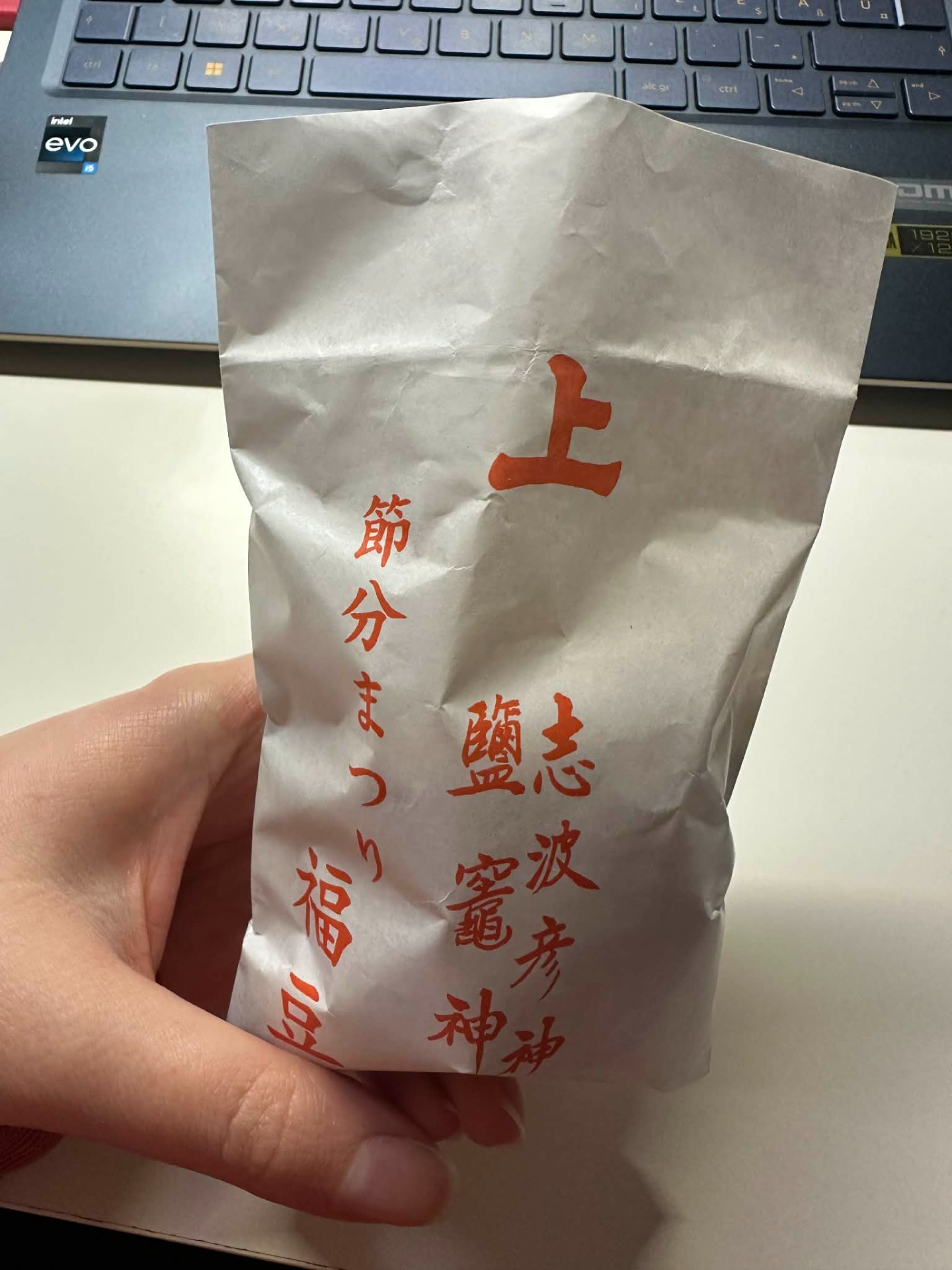 E mellett kaptunk még egy zacskó szójababot, amit setsubun-kor szokás használni (arról majd később 😉). Ezt fukumame-nak(福豆) hívják.